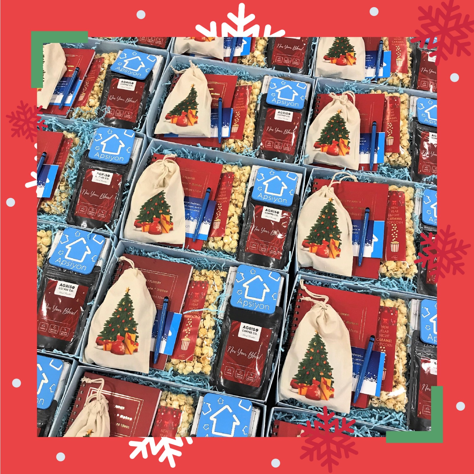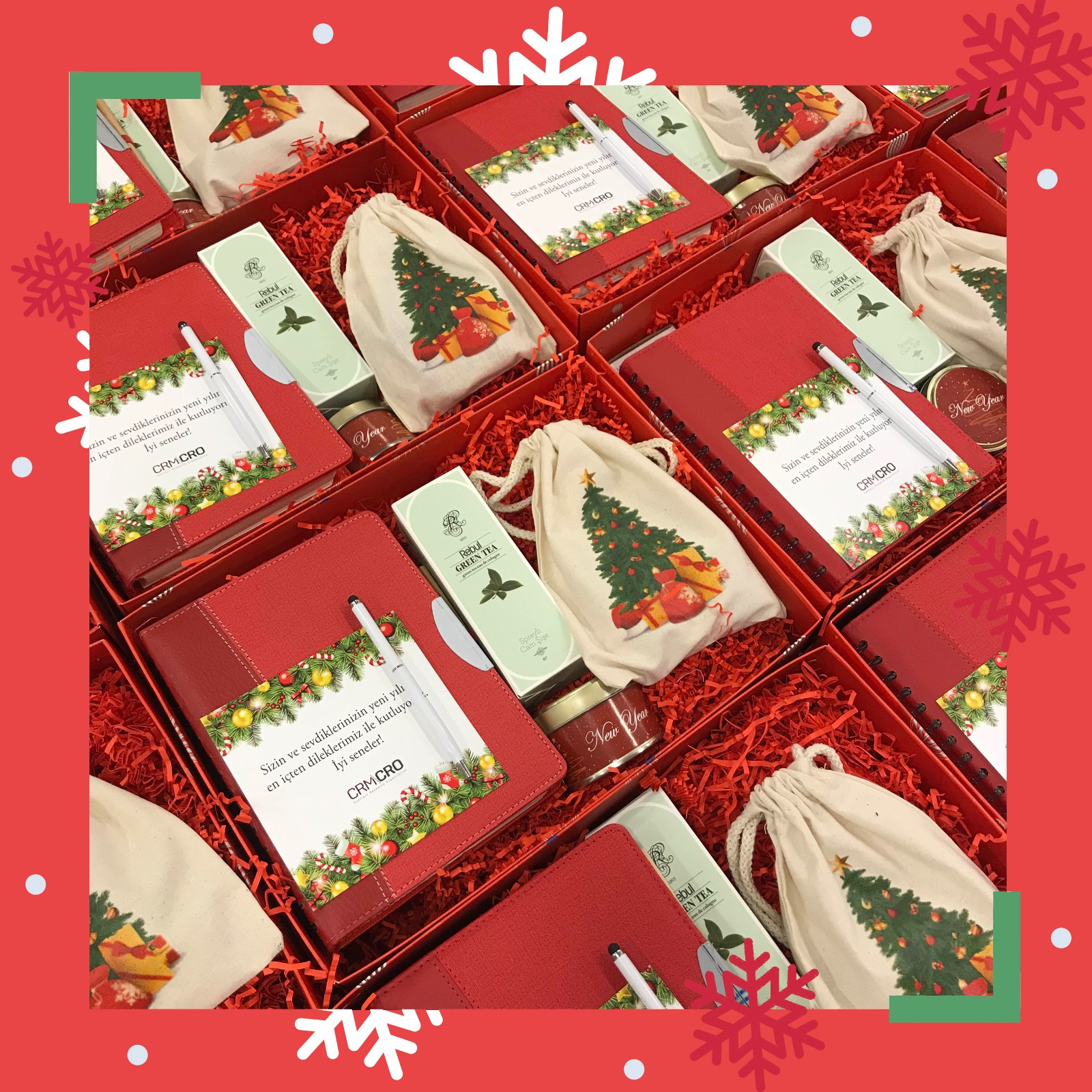 Görsellerde gördüğünüz gibi, her kutu hem yılbaşı ruhunu yansıtıyor hem de markanıza özel hale getirilebiliyor.