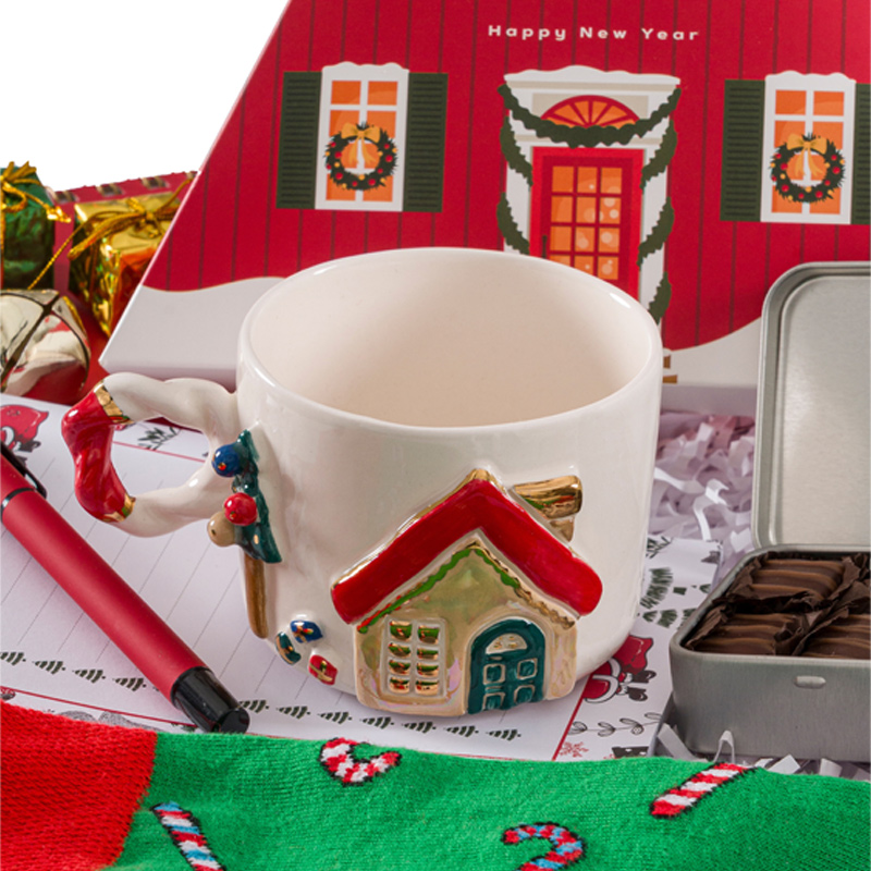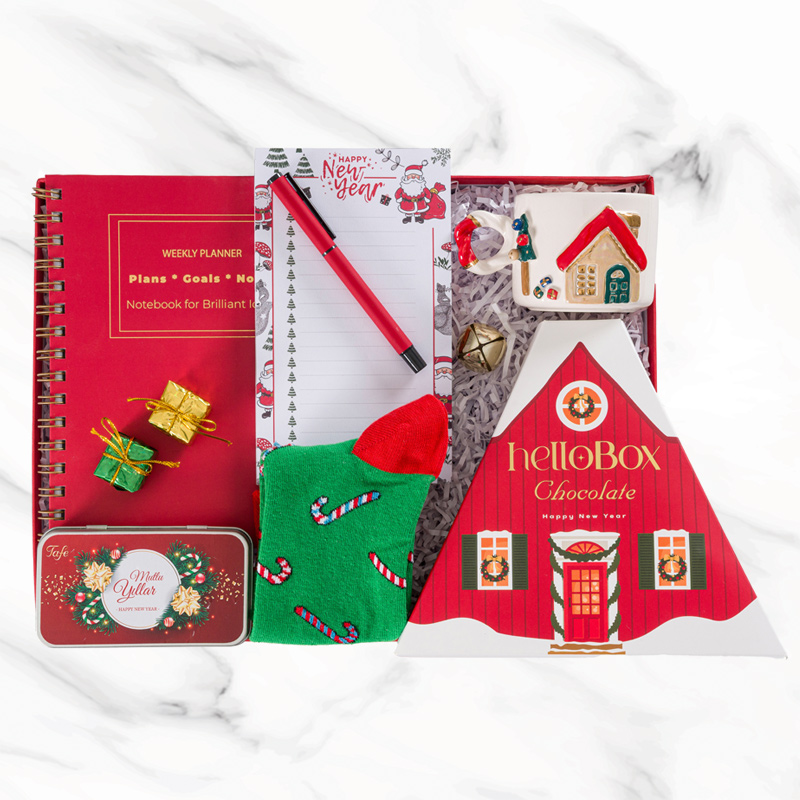 Yanında bulunan notluk, kalem, ve renkli yılbaşı çorabı ise bu özel kutuyu tamamlayan küçük mutluluklar.